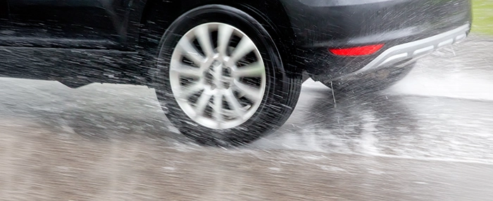 Na een regenbui kan het zijn dat er plassen water op de weg blijven liggen. Er komt dan water tussen de band van het voertuig en het wegdek. Als het profiel van uw banden het water niet snel genoeg kan wegwerken, verliest de band contact met het wegdek en rijdt u als het ware op de plas water. Dit heet aquaplaning.